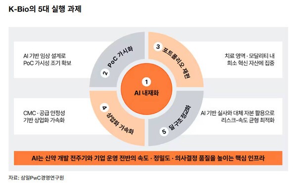 삼일PwC의 보고서는 한국 바이오 기업이 글로벌 시장에서 성공하기 위해 주력해야 할 5대 실행 과제를 제시했다. AI 내재화를 기업의 기본 운영체제로 삼고, PoC(개념 검증) 가시화 전략을 고도화해야 한다는 점이 강조됐다. 또한, 희소 혁신 자산에 집중하고, 상업화 가속을 위한 CMC 역량을 조기 확보하는 것이 필요하다. 이러한 과제를 통해 한국 기업들이 글로벌 시장에서 선택받을 수 있는 기반을 마련해야 한다.